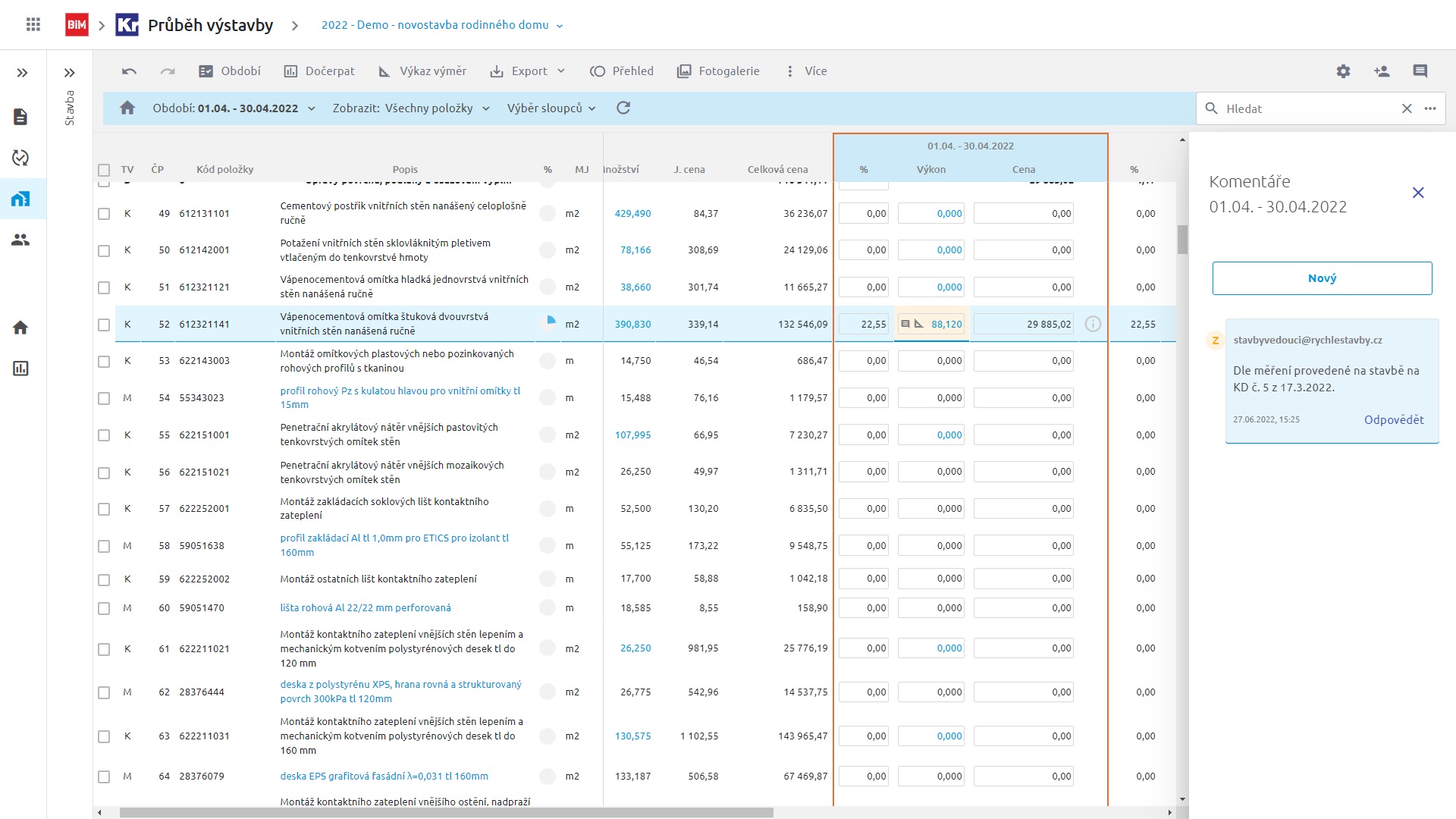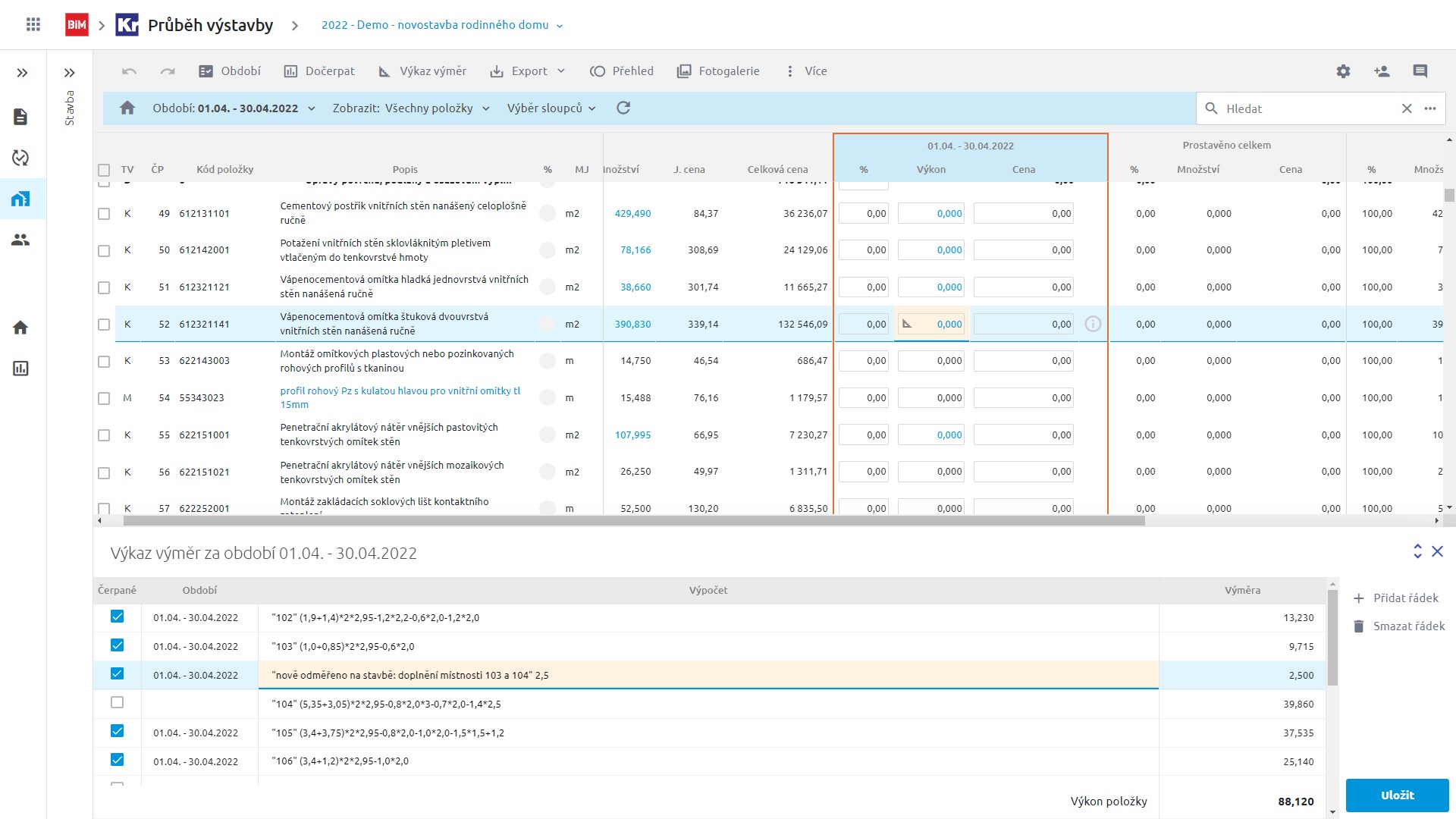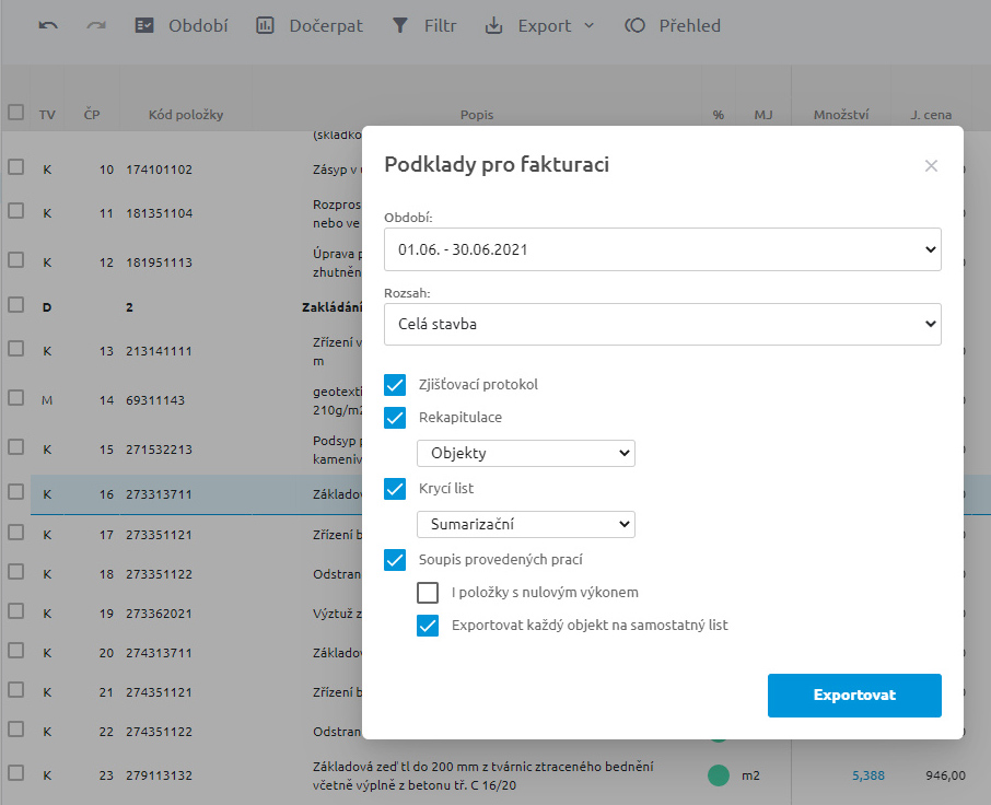 Udržujte si během realizace přehled o provedených pracích na celé stavbě. Vytvořte si snadno podklady pro fakturaci. Čerpat lze po obdobích pomocí zadávání výkonů, ceny, výkazem výměr nebo hromadně po položkách. Stav položek čerpání vidíte okamžitě po editaci.