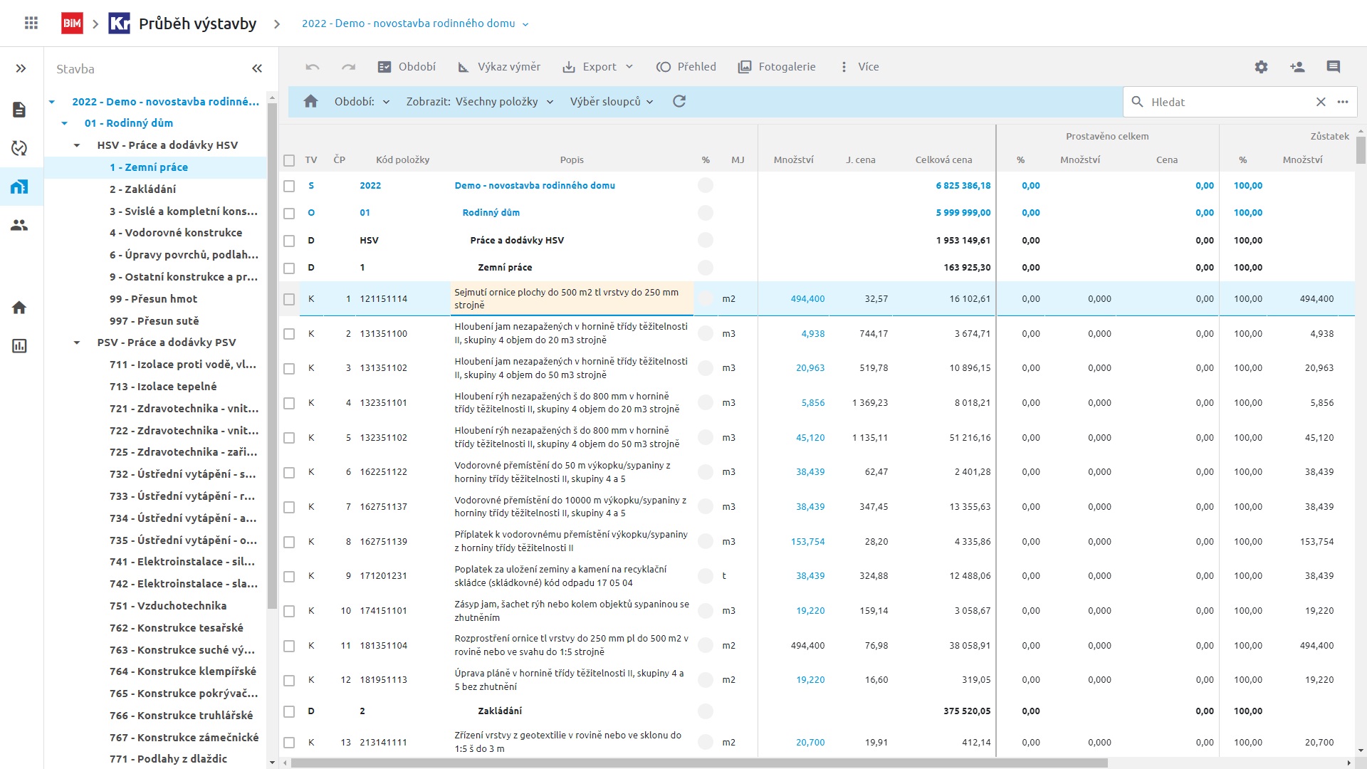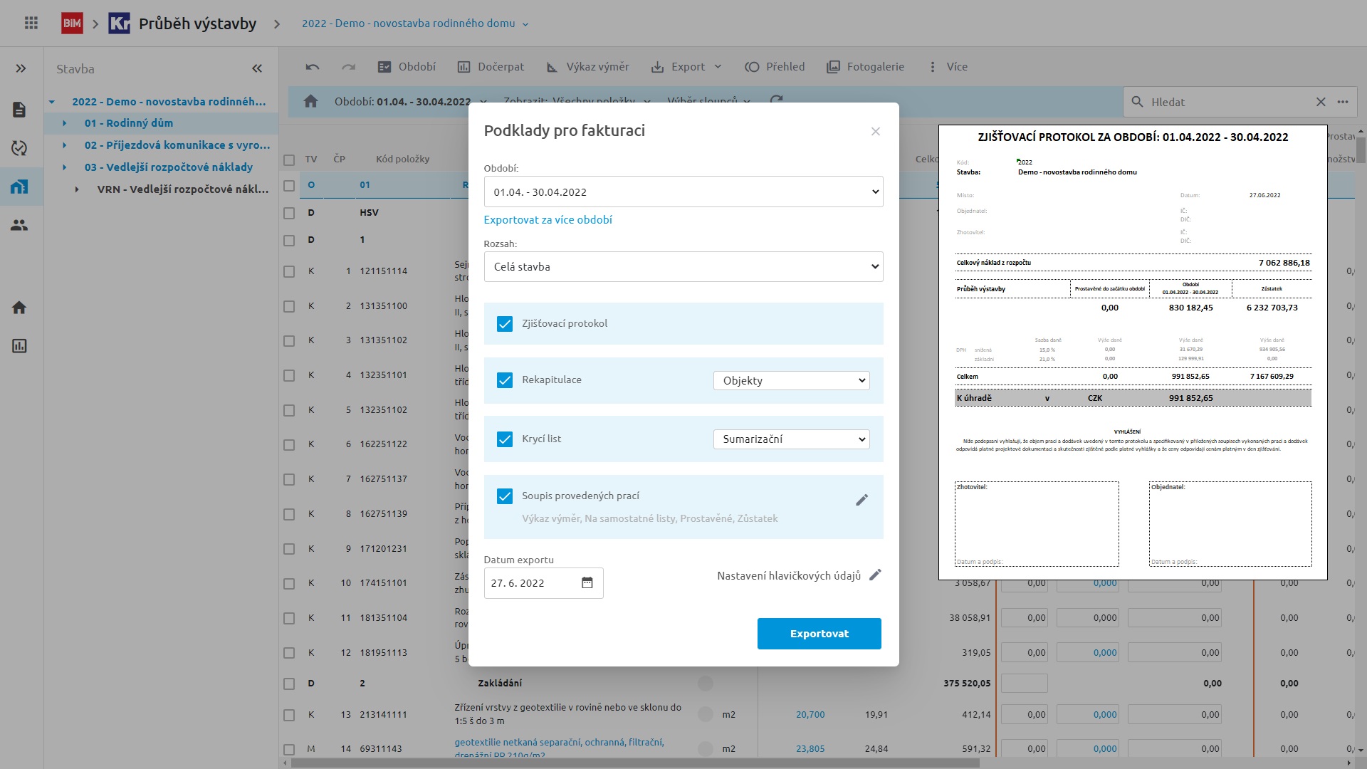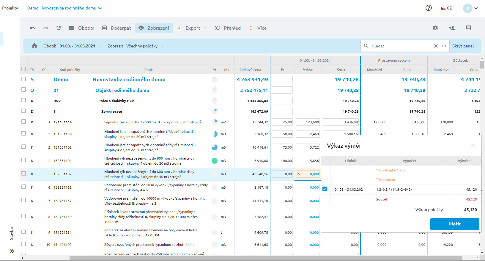 Udržujte si během realizace přehled o provedených pracích na celé stavbě. Vytvořte si snadno podklady pro fakturaci. Čerpat lze po obdobích pomocí zadávání výkonů, ceny, výkazem výměr nebo hromadně po položkách. Stav položek čerpání vidíte okamžitě po editaci.