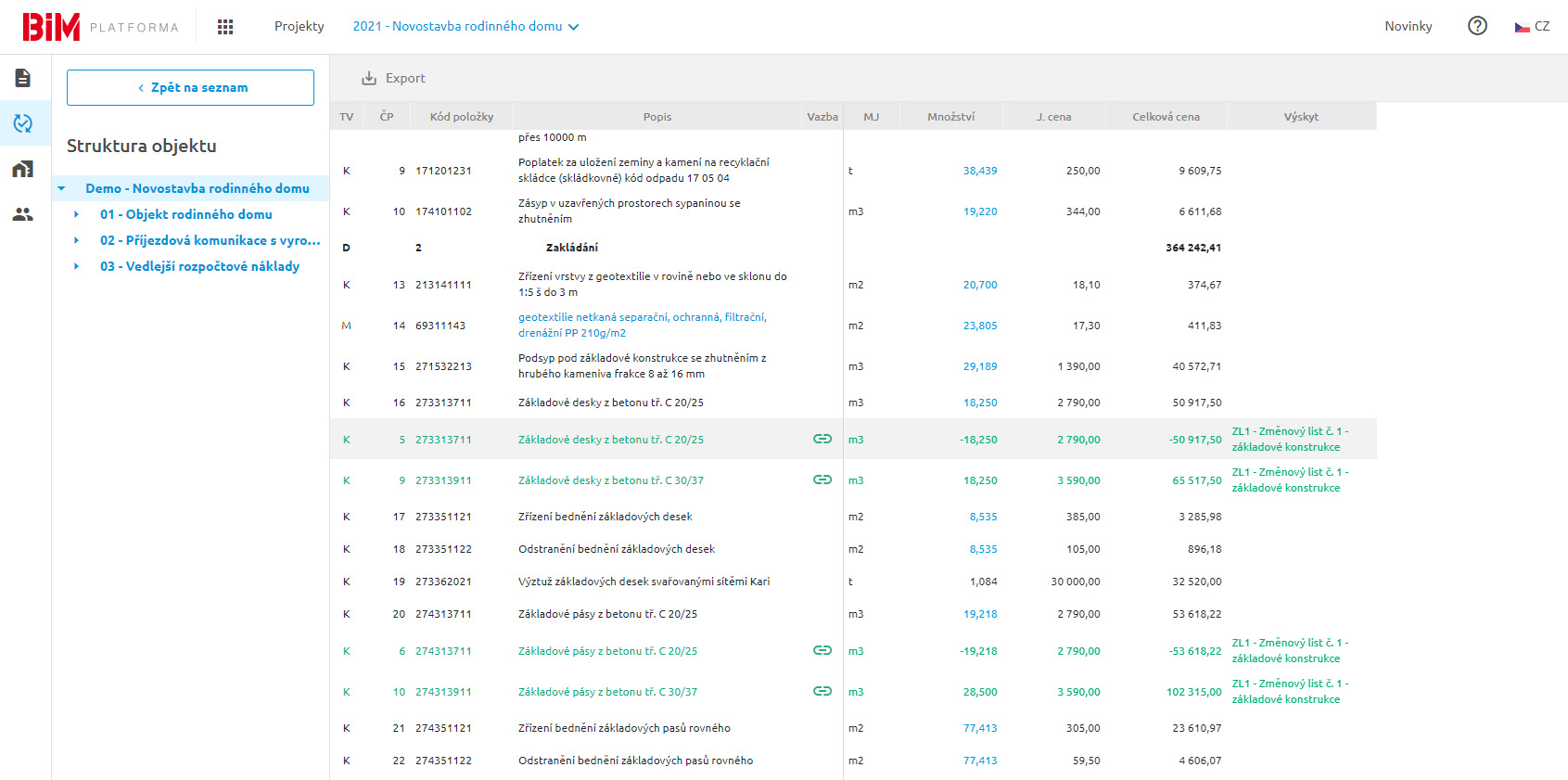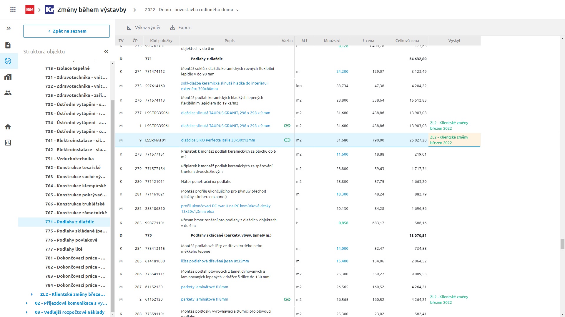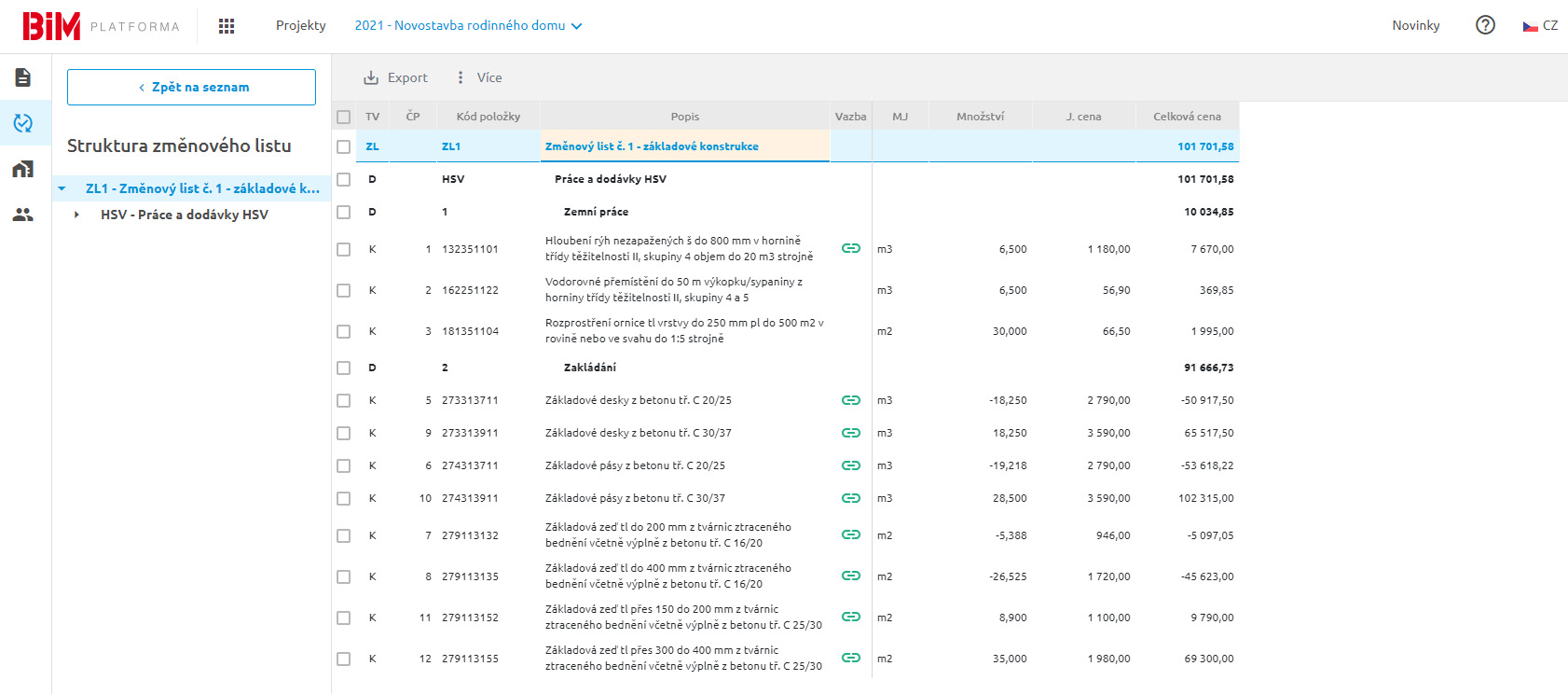 Vazba změnových položek na původní - změnové položky jsou přehledně řazeny pod původní, abyste měli dokonalý přehled o všech změnách, které se na stavbě vyskytují. Samozřejmostí je úprava nebo vytvoření vlastních vazeb, což je výhodné zejména při řešení klientských změn a zobrazení kompletní historie položek.