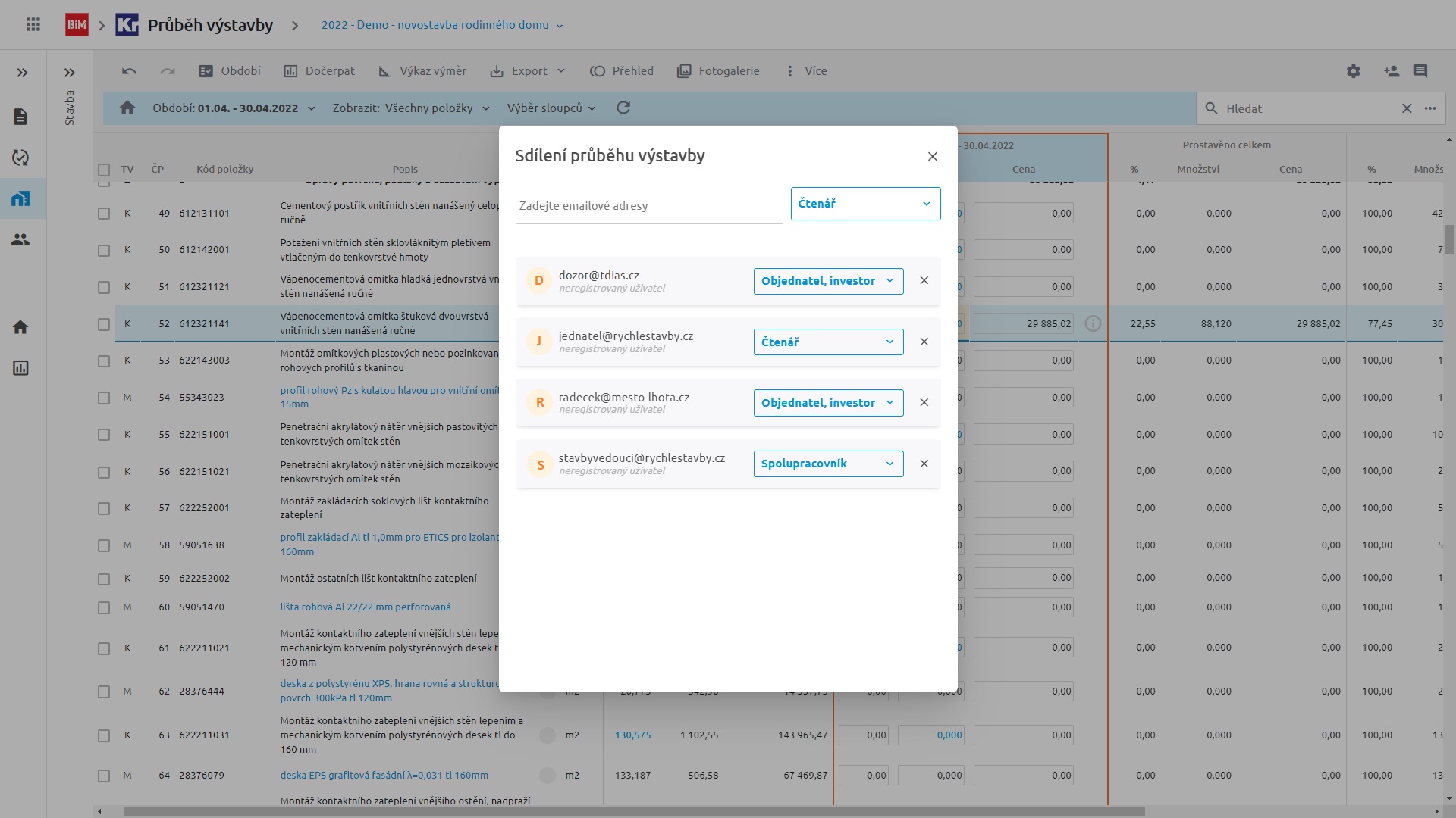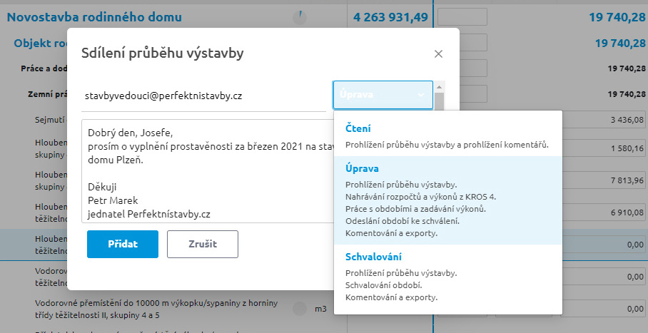 Průběh výstavby jednoduše sdílíte s ostatními partnery. Například stavbyvedoucí tak zapisuje výkony přímo na stavbě třeba z mobilu. Ani pro další komunikaci s investorem nemusíte exportovat další soubory, protože se všichni společně díváte do jednoho dokumentu. Partnerům nastavíte práva buď pro editaci nebo pouze pro čtení. Díky 100GB cloudovému úložišti můžete sdílet i další dokumenty související se zakázkou.