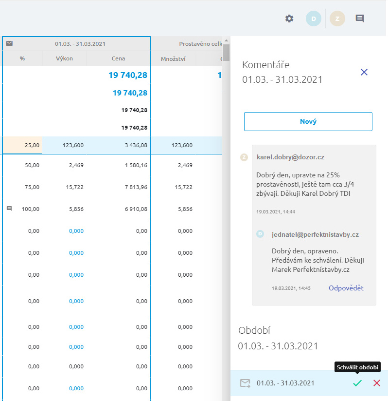 Celá komunikace a připomínkování soupisů provedených prací je soustředěna na jednom místě. I díky kompletní historii komentářů je schvalování podkladů pro fakturaci mnohem jednodušší a rychlejší.