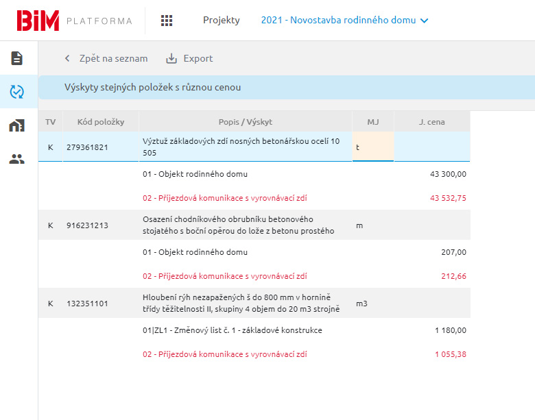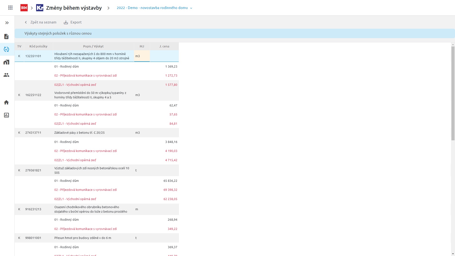 Často se musí dle smlouvy dodržovat jednotkové ceny změnových položek stejné jako v původním rozpočtu. Pro jednoduchou kontrolu jsou z tohoto důvodu do ZBV zapracovány Výskyty stejných položek s různou cenou.