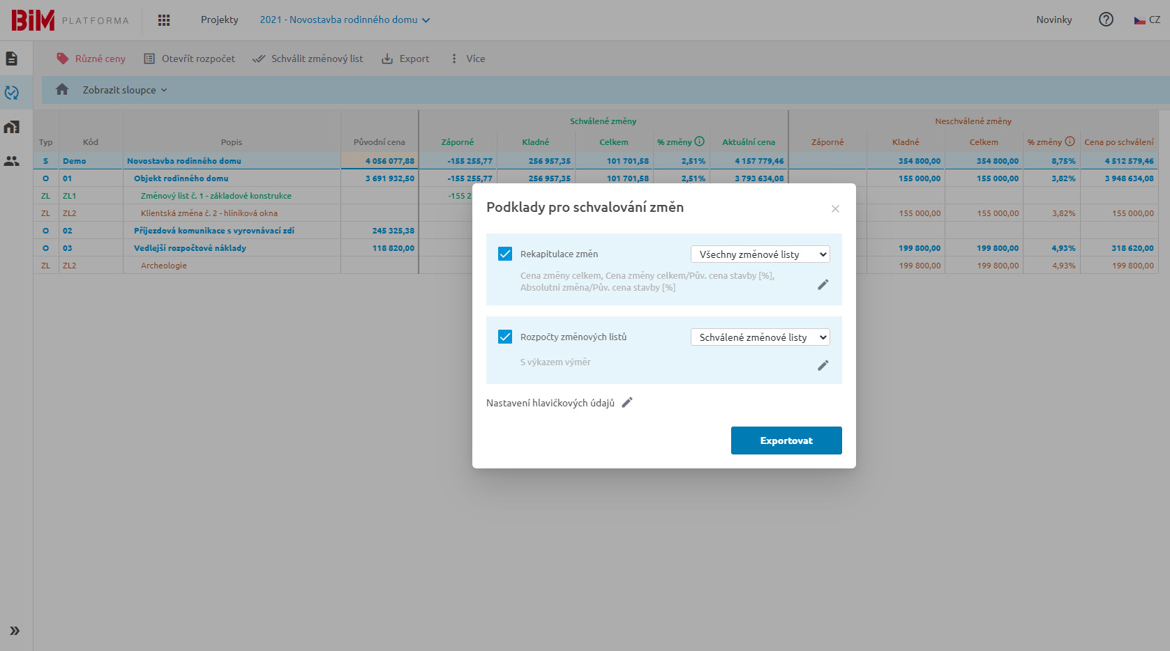 Pohledy a exporty do XLS - Aplikace umožňuje široké možnosti exportů do XLS (rekapitulace změn, rozpočty změnových listů) a pohledy ověřující stejnou cenu mezi původním rozpočtem a dodatky.