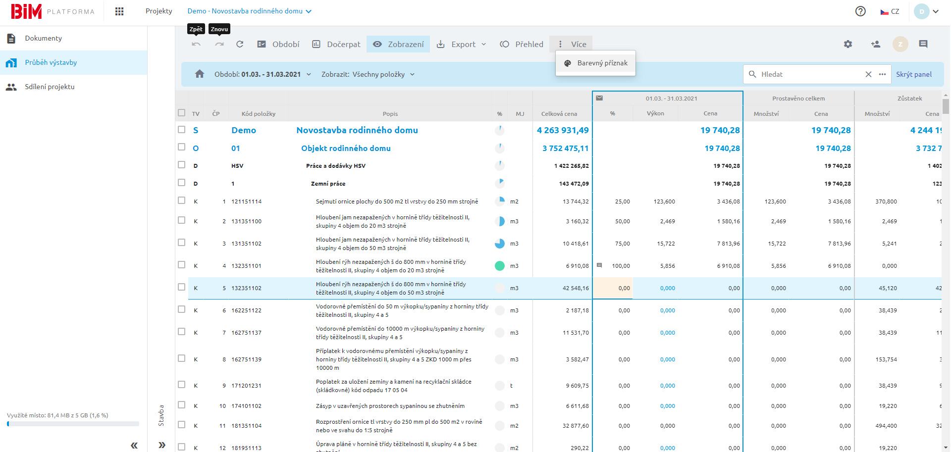 Schvalování změnových listů - Schválené změnové listy můžete čerpat v Průběhu výstavby, kde jsou barevně odlišeny od položek původního rozpočtu.