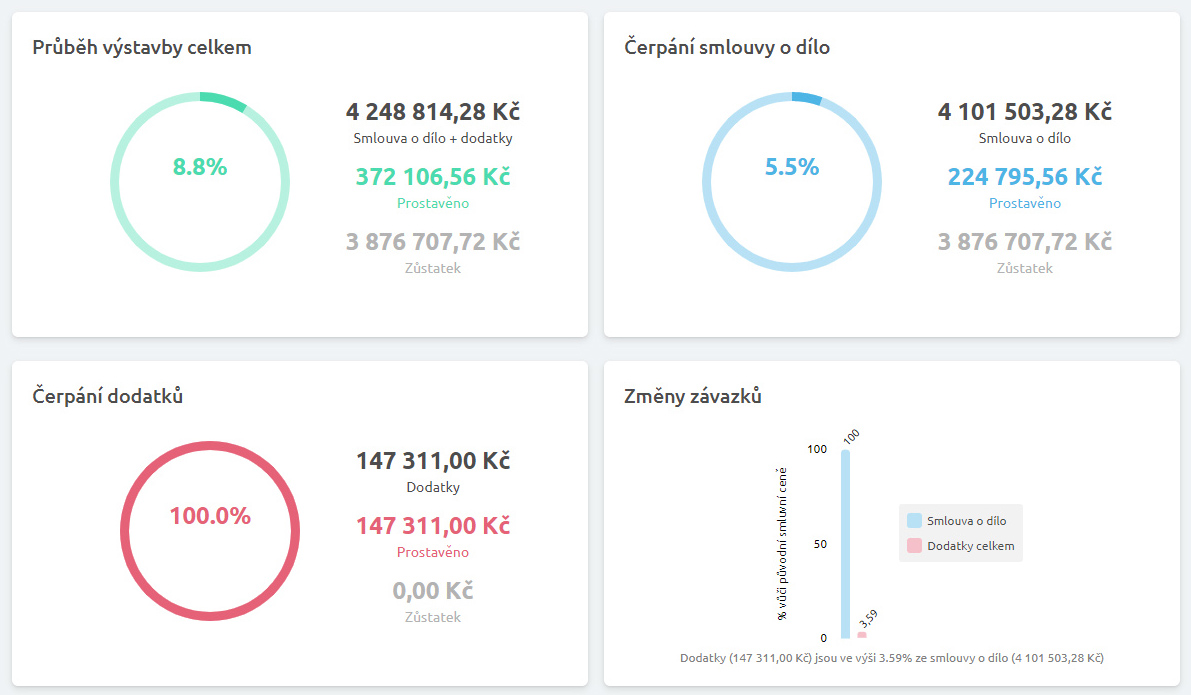 Webová aplikace Průběh výstavby přináší přehledné čerpání rozpočtu a efektivní komunikaci mezi všemi účastníky výstavby přes webový prohlížeč.