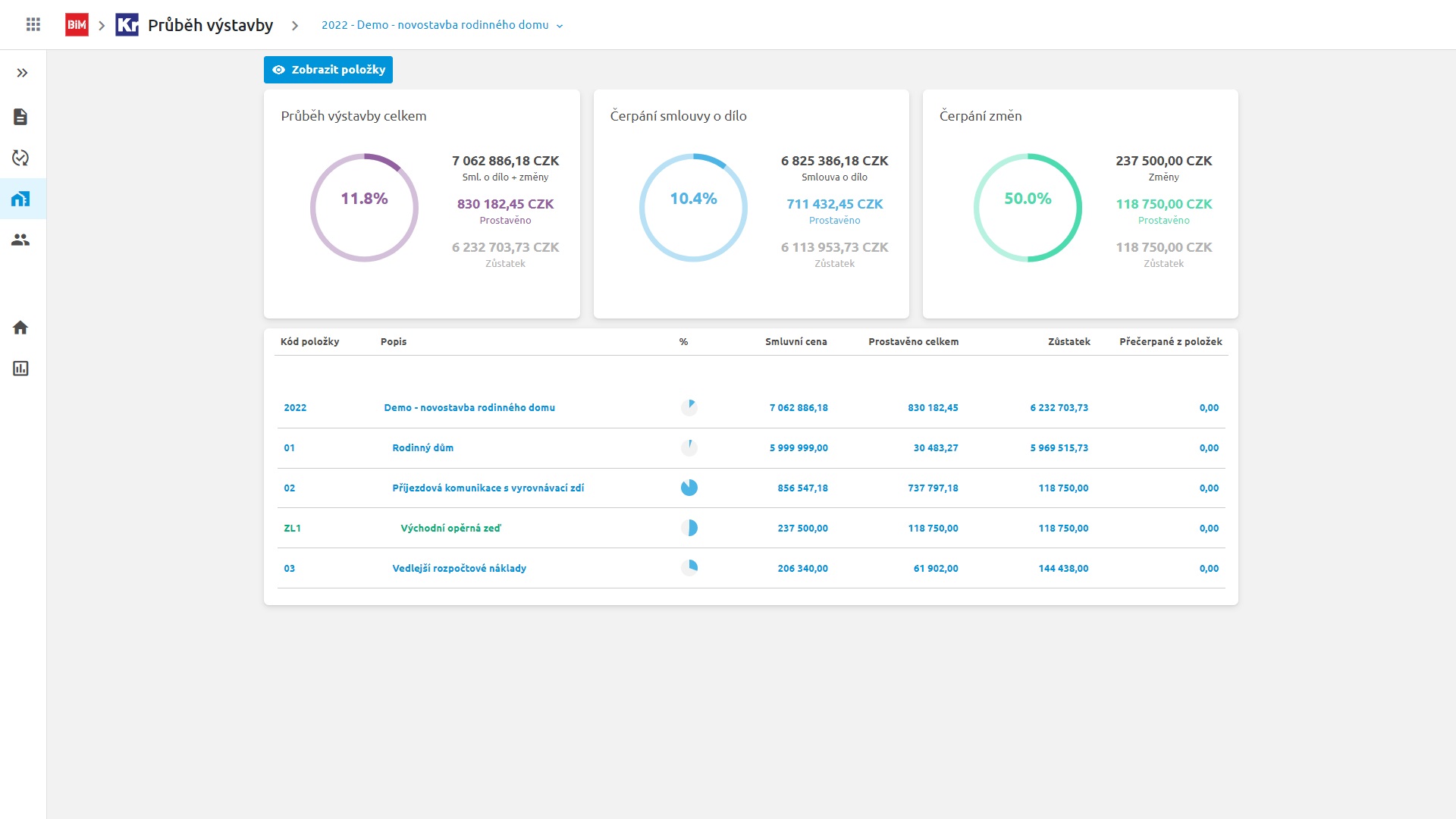 Všechny informace o čerpání celé stavby včetně předchozích období vidíte hned v jednom okně. Máte jasný přehled, co bylo smluvně dohodnuto s investorem a jaký je aktuální stav stavby včetně evidence změn. Spolu s Přehledem projektů vidíte aktuální rozčerpanost všech zakázek.
