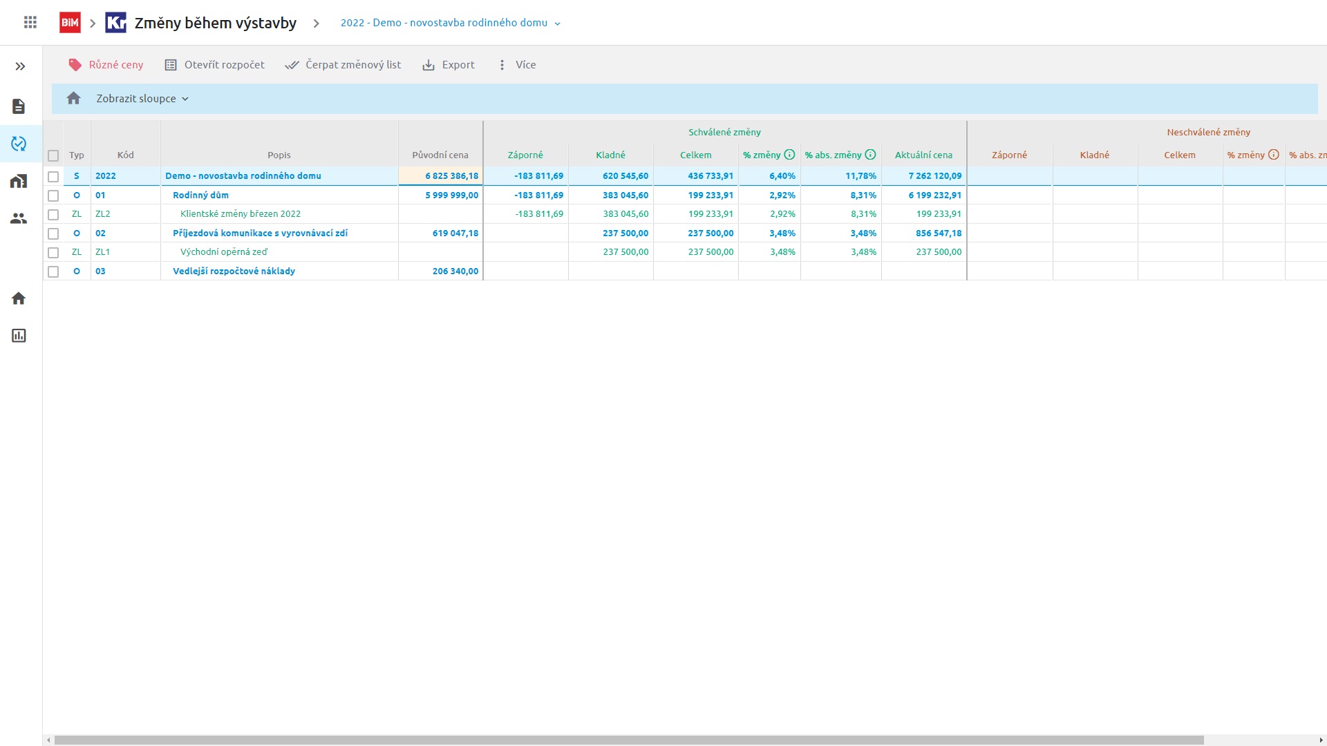 Snadné sledování vlivu změn - díky širokým možnostem nastavení zobrazení dokážete rychle zjistit požadovanou informaci (% podíl změny na původní rozpočet, rozdělení cen na kladné/záporné, absolutní hodnota změny apod.).