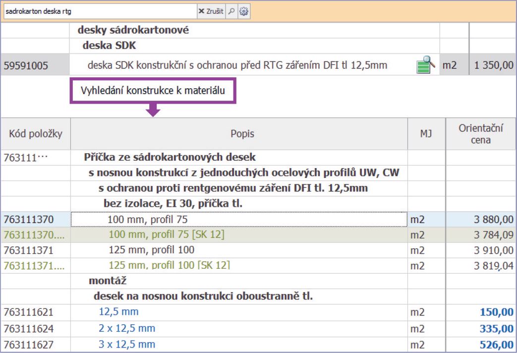 Příklad: Chci ocenit realizaci SDK příčky s ochranou před RTG zářením. Vyhledám si v materiálech konkrétní desku a nechám si zobrazit všechny konstrukce, které s ní souvisejí. Následně zapíšu do rozpočtu položku kompletní konstrukce nebo montáže.