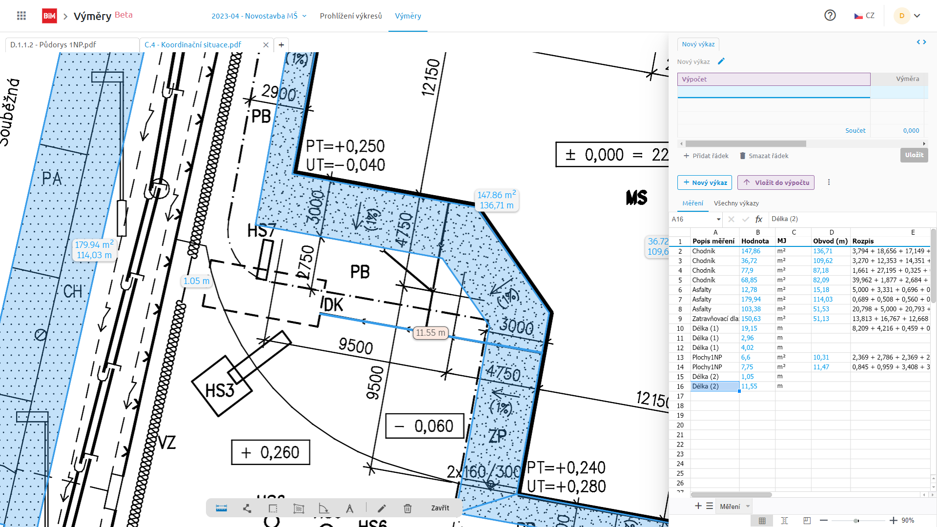 Odměřování hodnot z výkresu - při jednoduchém odměřování délek, ploch či úhlů je zjištění výměry otázkou okamžiku. Každé měření se zobrazí přímo ve výkresu a zároveň se uloží do tabulky měření, kde je k dispozici při tvorbě výkazu výměr. V aplikaci otevřete všechny výkresy ve všech formátech PDF a DWG.