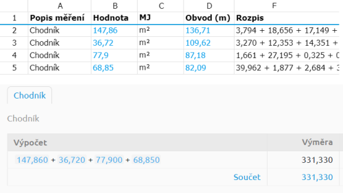Automatické sčítání měření - otravuje vás nekonečné zadávání hodnot do výkazu výměr? Díky možnosti zadání popisu k měření se vám budou automaticky sčítat jednotlivá měření. Nespornou výhodou je, že každé měření obsahuje automaticky údaj, z jakého výkresu bylo množství odečtené. Nemusíte tedy nadále tento údaj ručně vypisovat do výpočtu.
